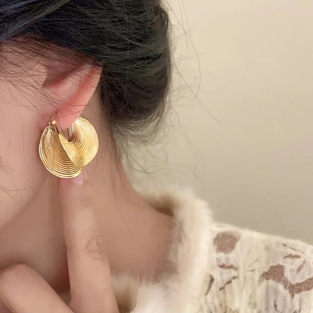 Bold, golden, and geometric — these sculptural fan-shaped earrings redefine modern elegance.